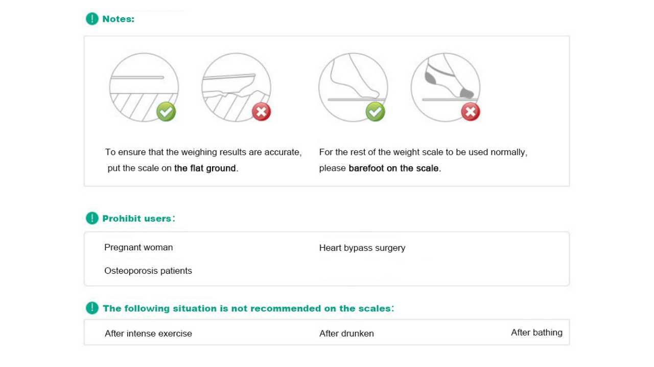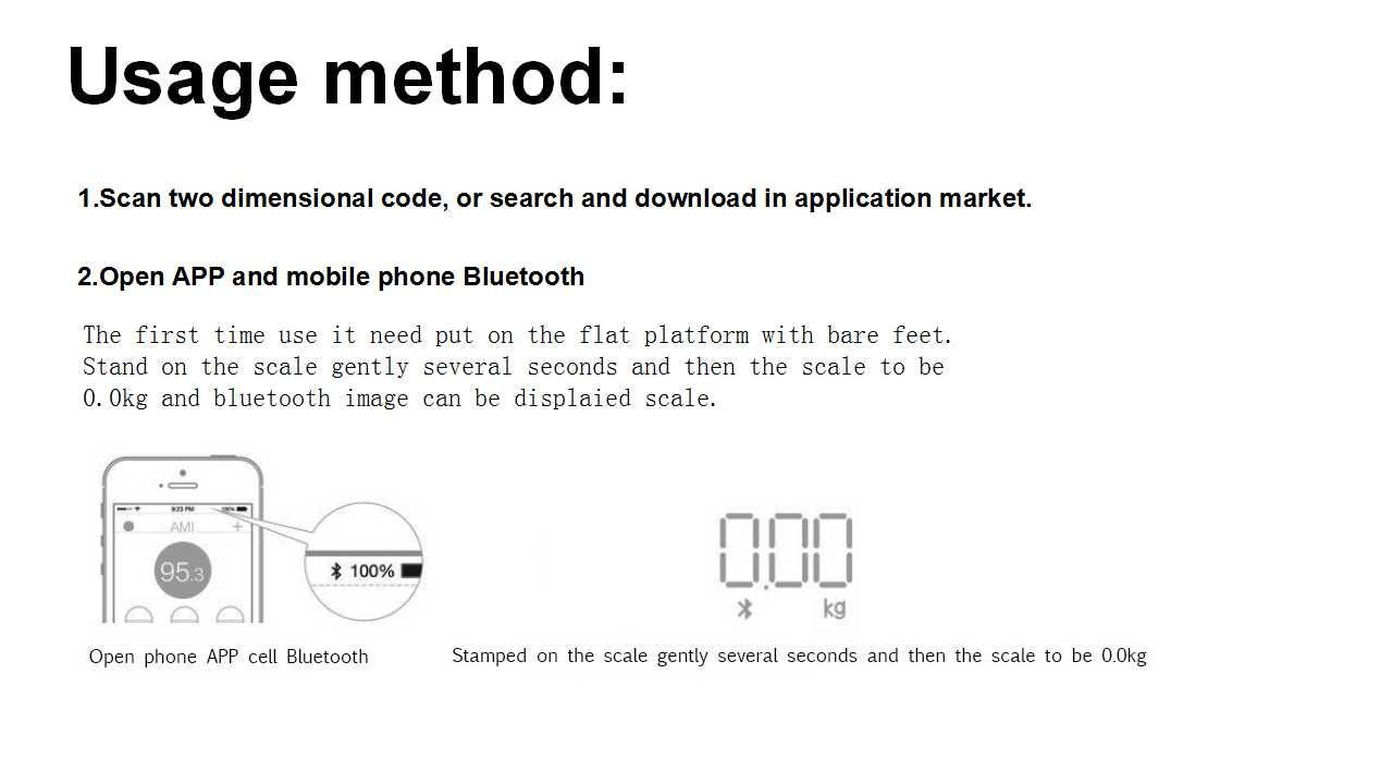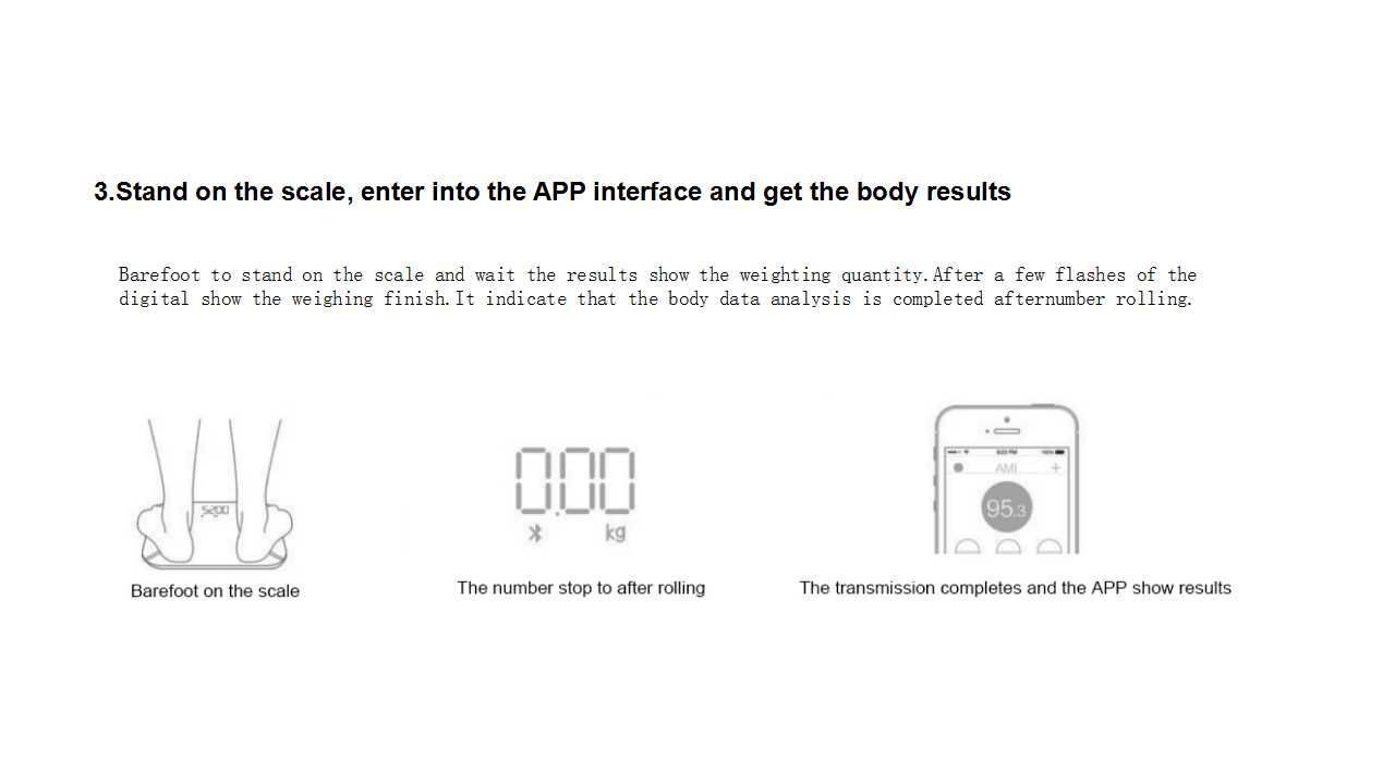 Surface Ground:Hard floor Wireless Mode:Bluetooth LE 4.2 Dimension:300*300*25mm Capacity:0.2~180KG (0.4~400lb) BIA technology:Dual Frequency Accuracy:50g (<100KG) 100g (100~180KG) Conductor:4 x ITO Surface:Ultra transparent toughened glass DisplayHeart Rate:LED Display for Weight Power:3*AAA Battery/Rechargeable lithium battery